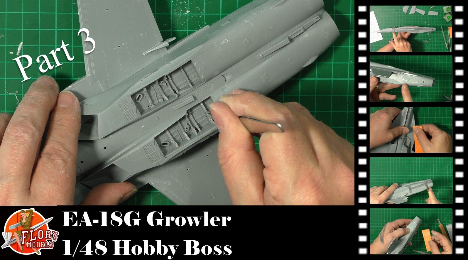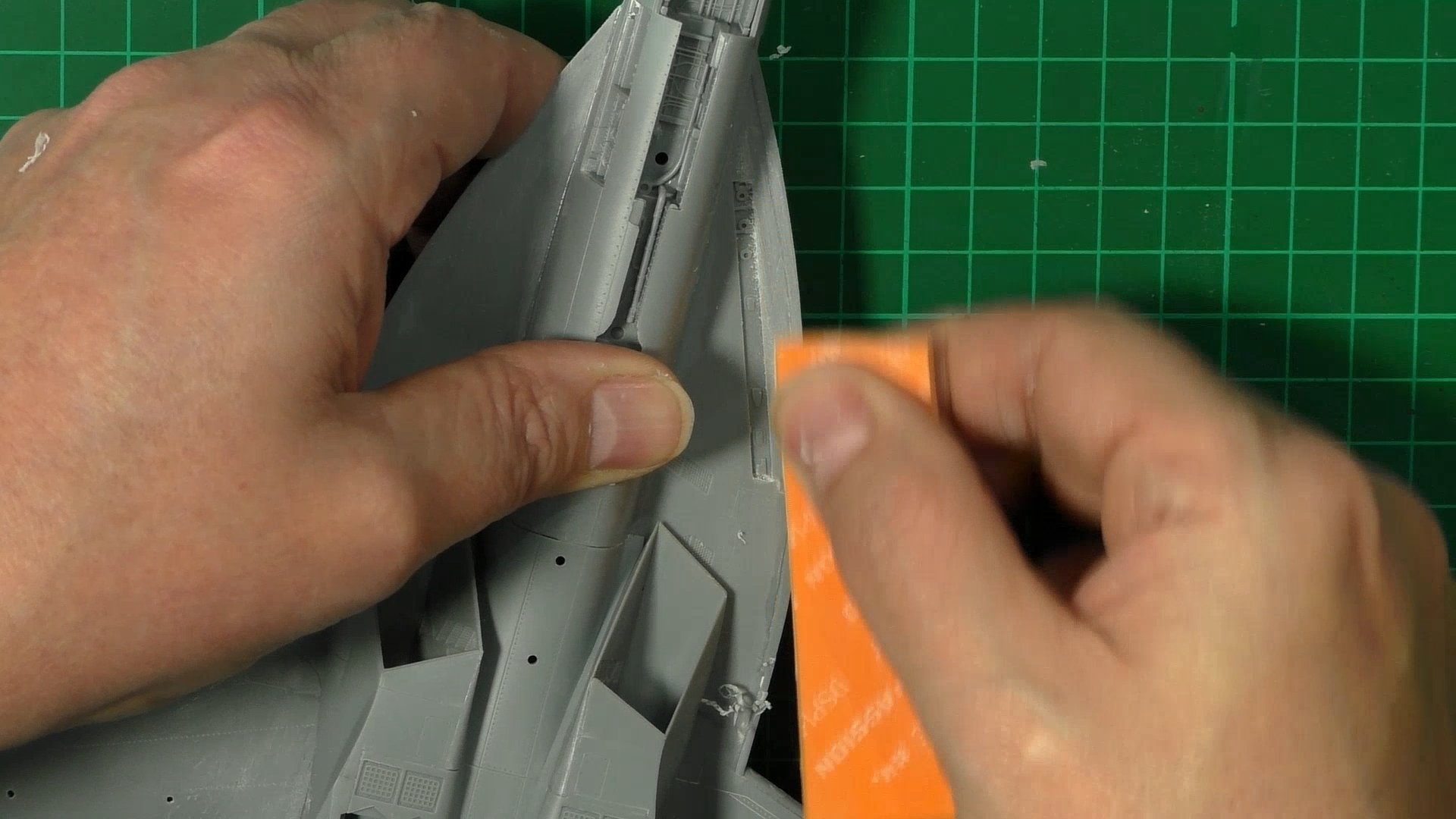 0:00 To Start we take care of all the seams and joins. This is mostly by sanding and polishing, but for a few, we use sprue goo. Then we add the details to the main gear wells. 16:11 Next, it's some final sanding and polishing, and we are ready to move on. 20:55 last up, we re-scribe and re-rivet all the details lost on the sanding.