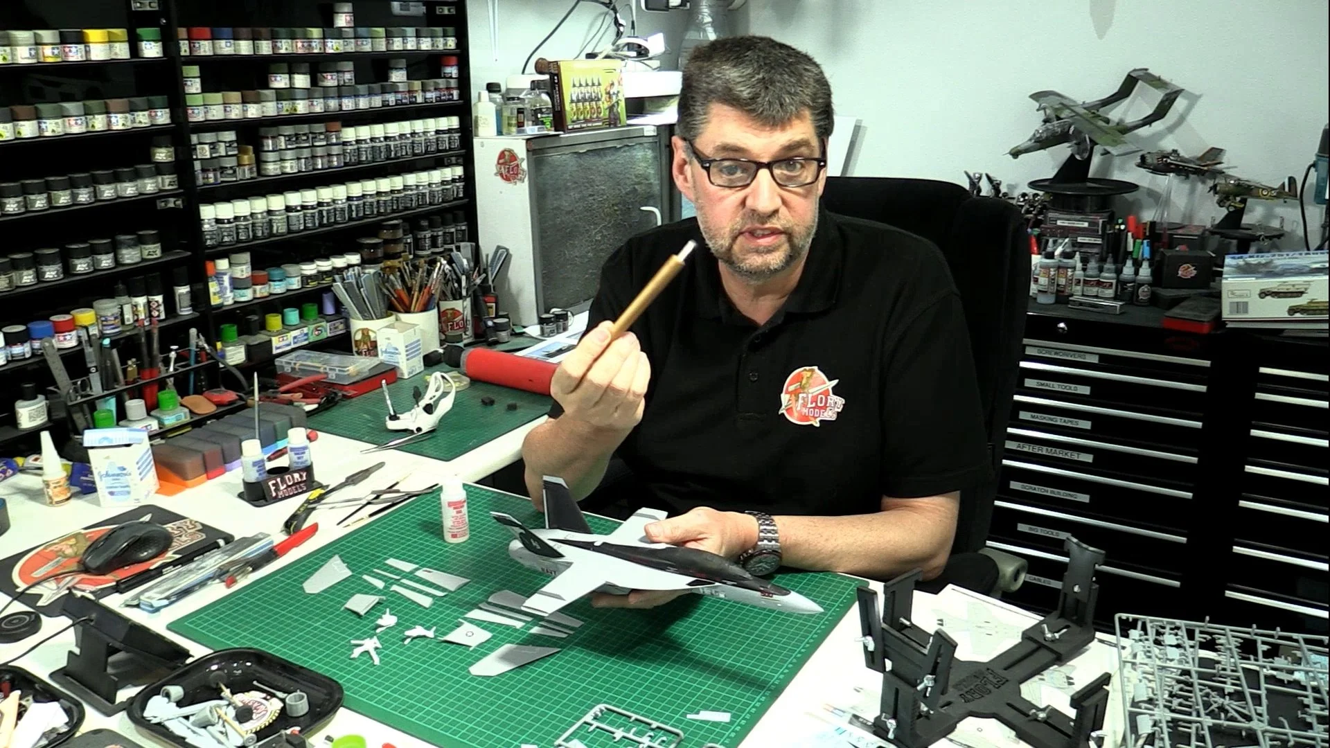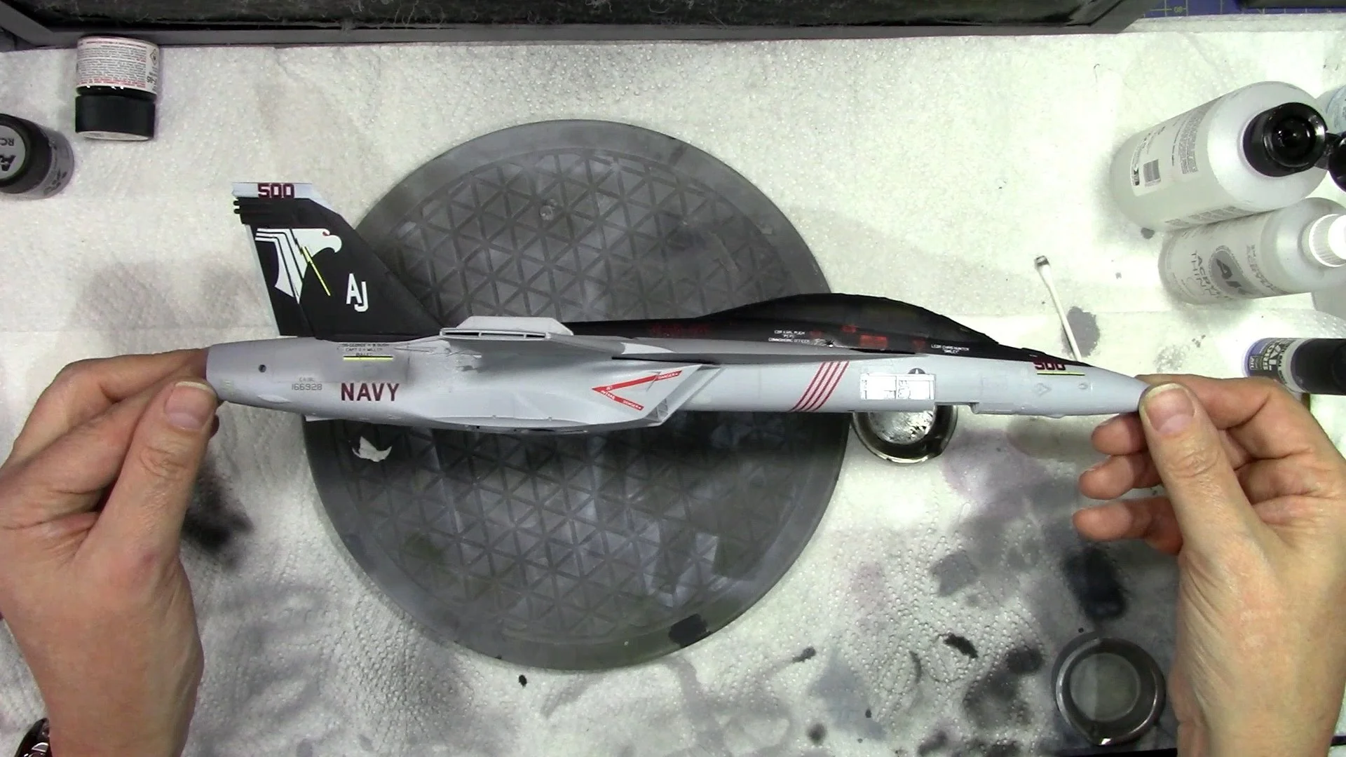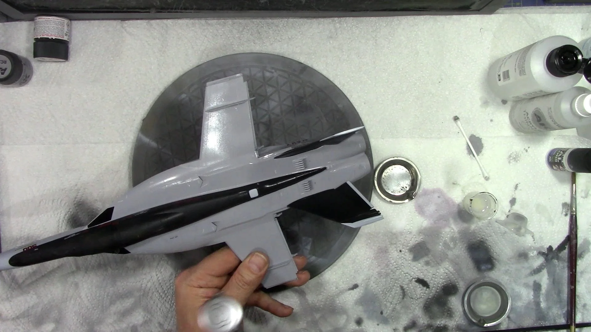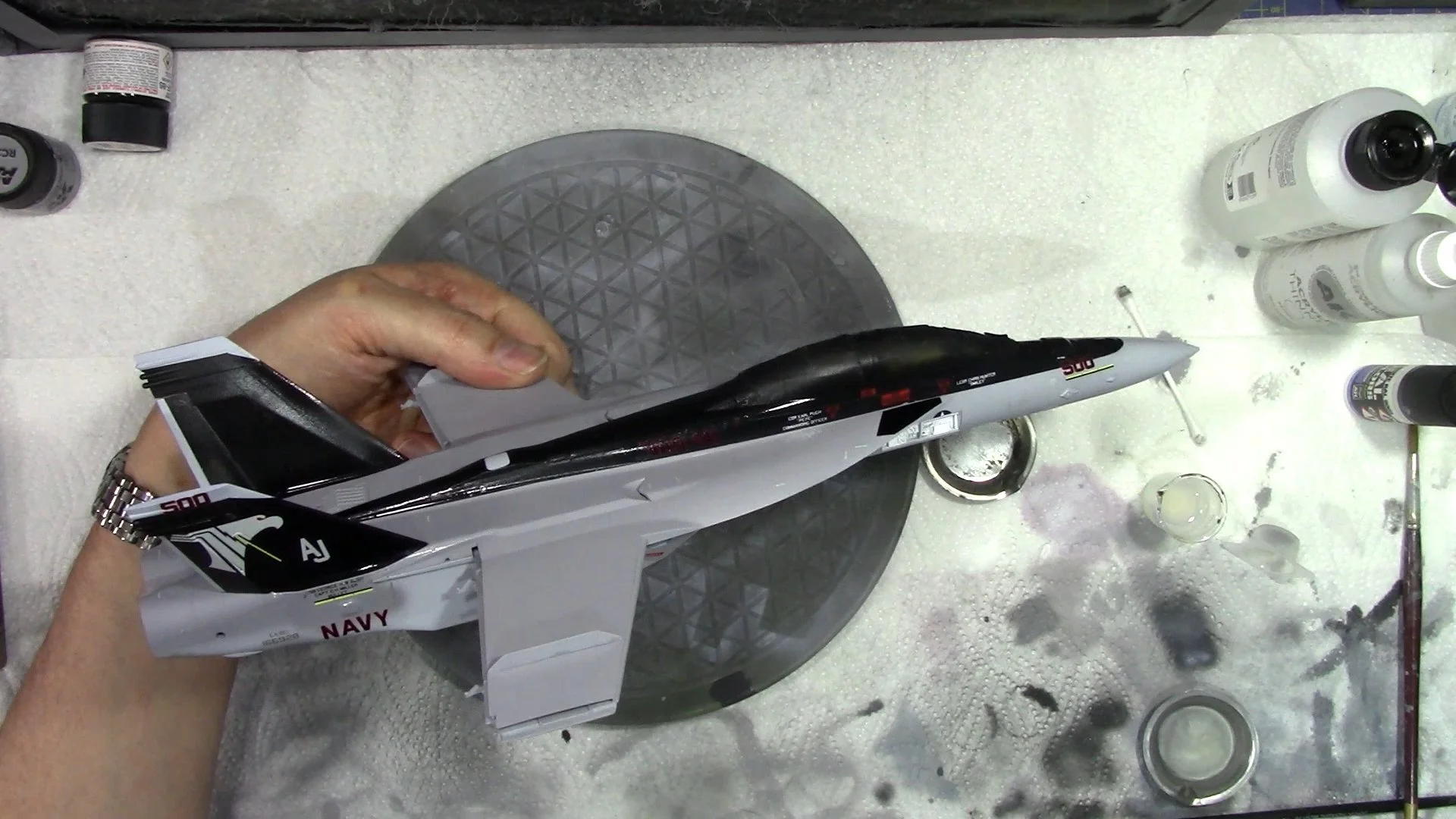 0:00 To start off, we start the long process of decaling. WE start with the Large culorful CAG markings and then follow up with the small stencil data markings. 15:55 With the decaling complete and settled down nicely, we move into the spray booth to seal them in with a coat of VMS XXL satin varnish.