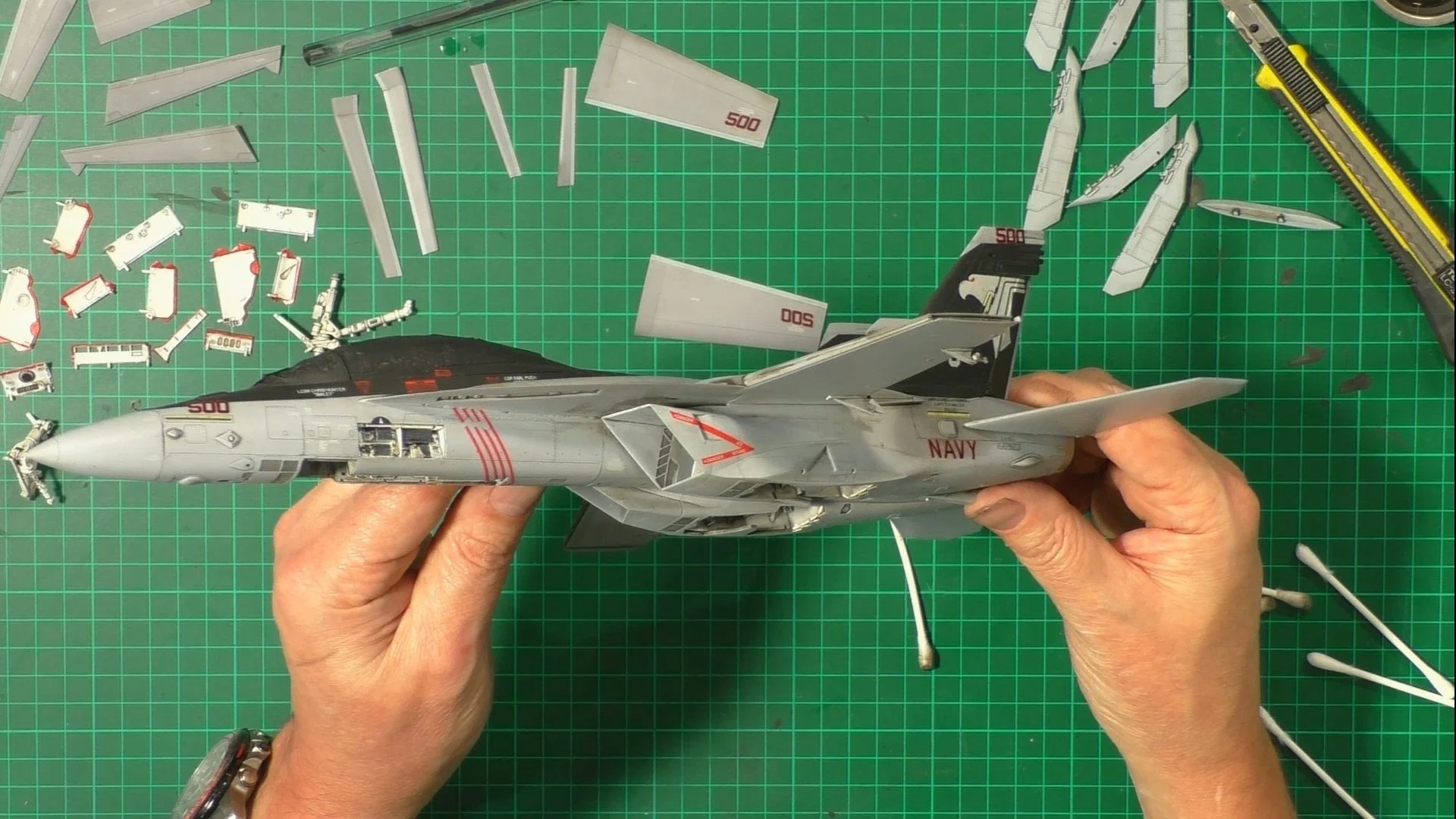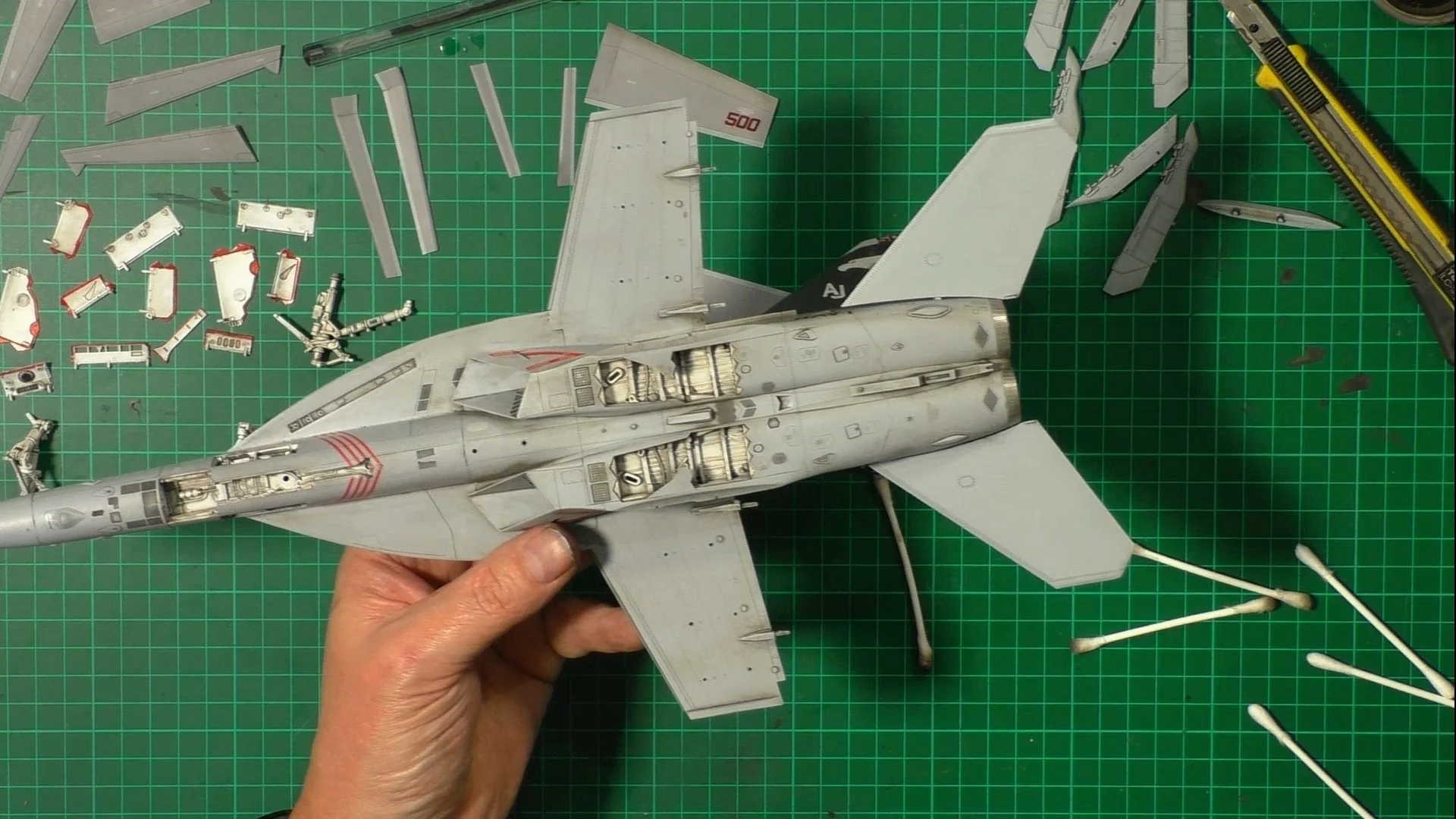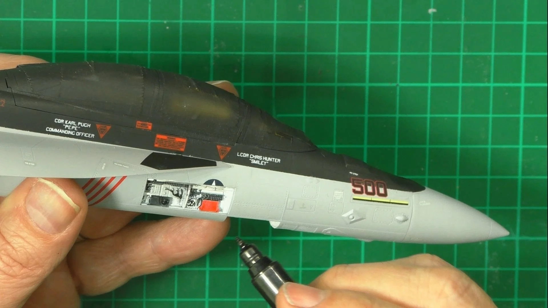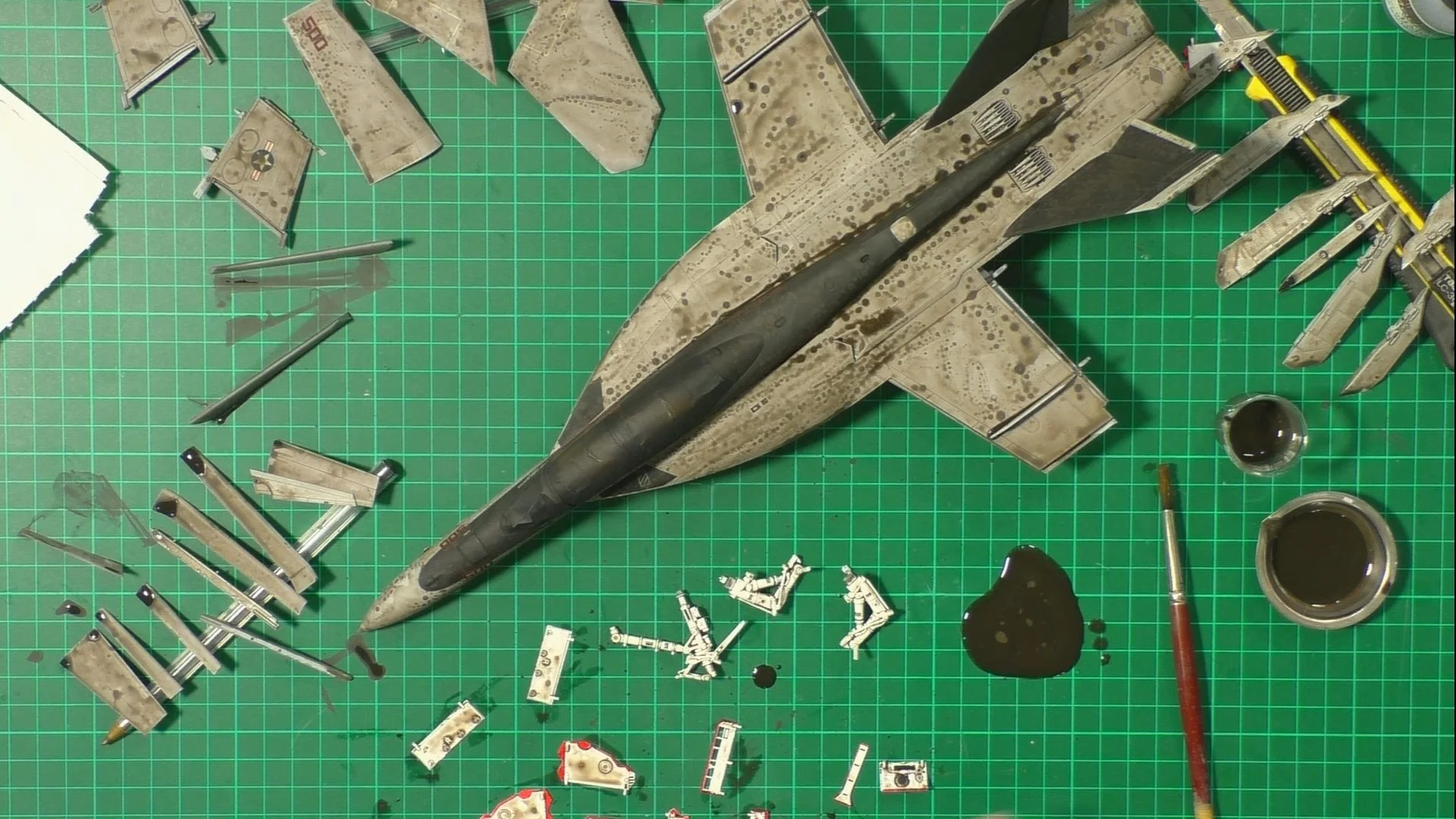 0:00 First up, we detail and paint the electronics bays with pens and fine brushes. 7:30 Here, we add the red edging to the gear doors with a red Sharpie pen. 11:34 Next, it's time to start the weathering. First up, we brush on a coat of Flory Models Dark dirt weathering wash over the whole model, and allow it to dry completely. 14:54 While it's drying, we make a diluted wash mix 50/%0 with tap water to thin the wash and brush on the gear and wheel wells. 19:34 With the wash completely dry, we wipe it down with a damp cloth and examine the results.