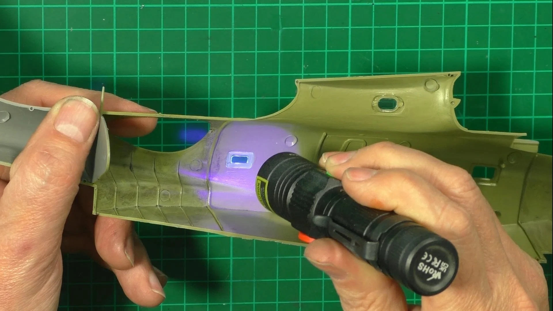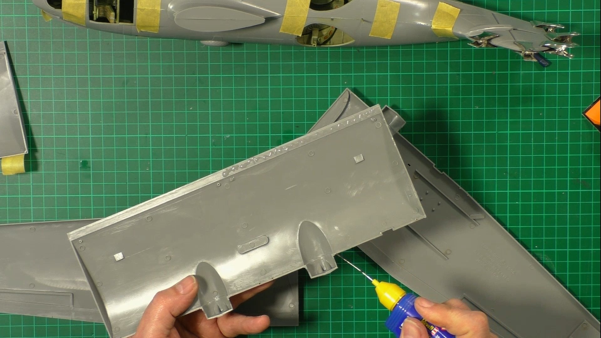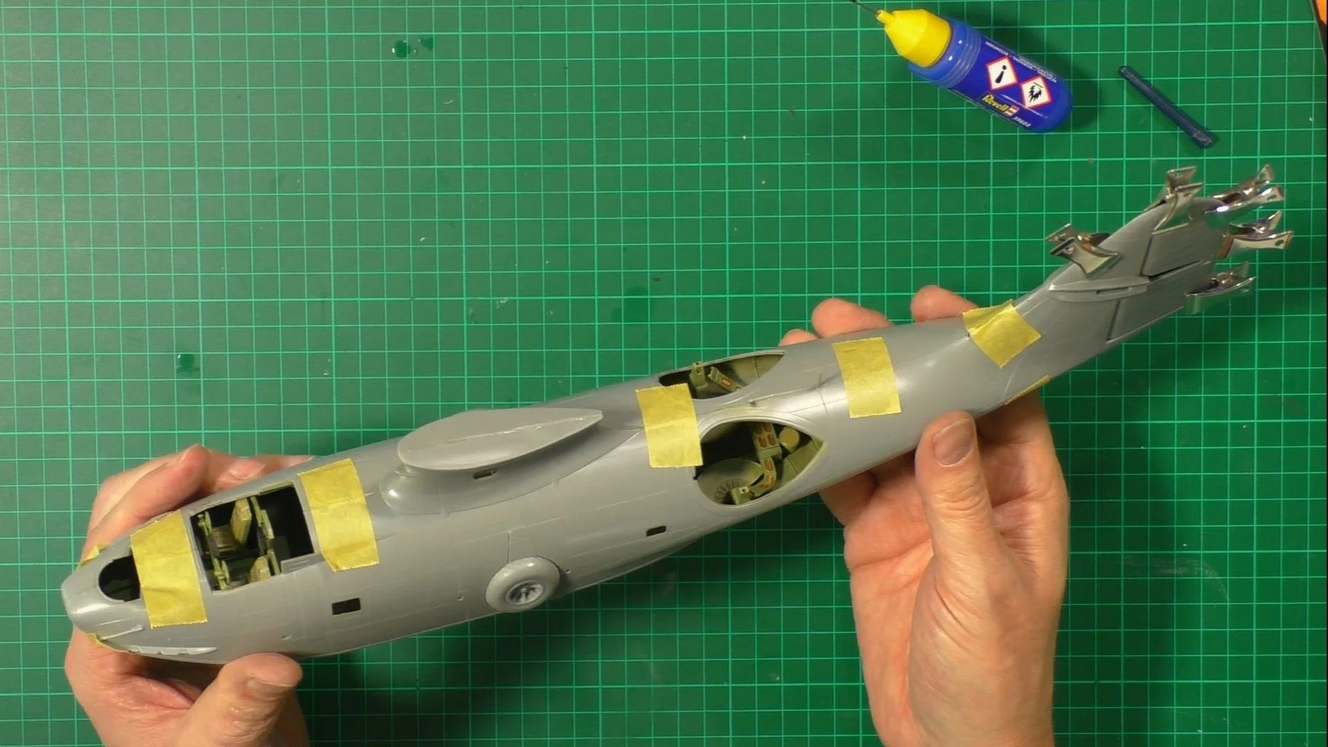 0:00 First up, we weather the cockpit with Metalizers and oils. 11:29 Next, we use UV glue to install the windows and test-fit the two halves together. 20:21 Now it's time to close up the two halves, we use contacta and tape for this. 27:58 Last up for now, we build the five-part wings.