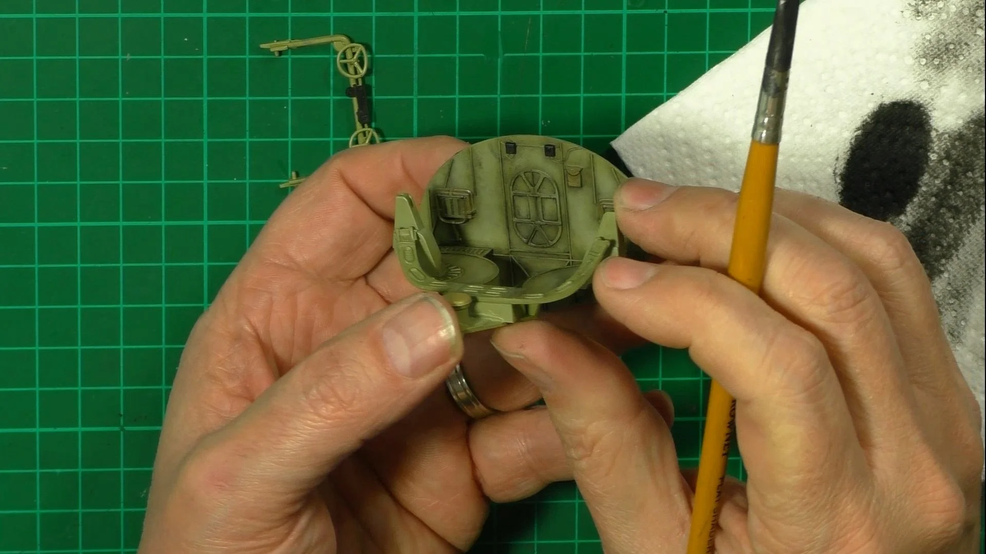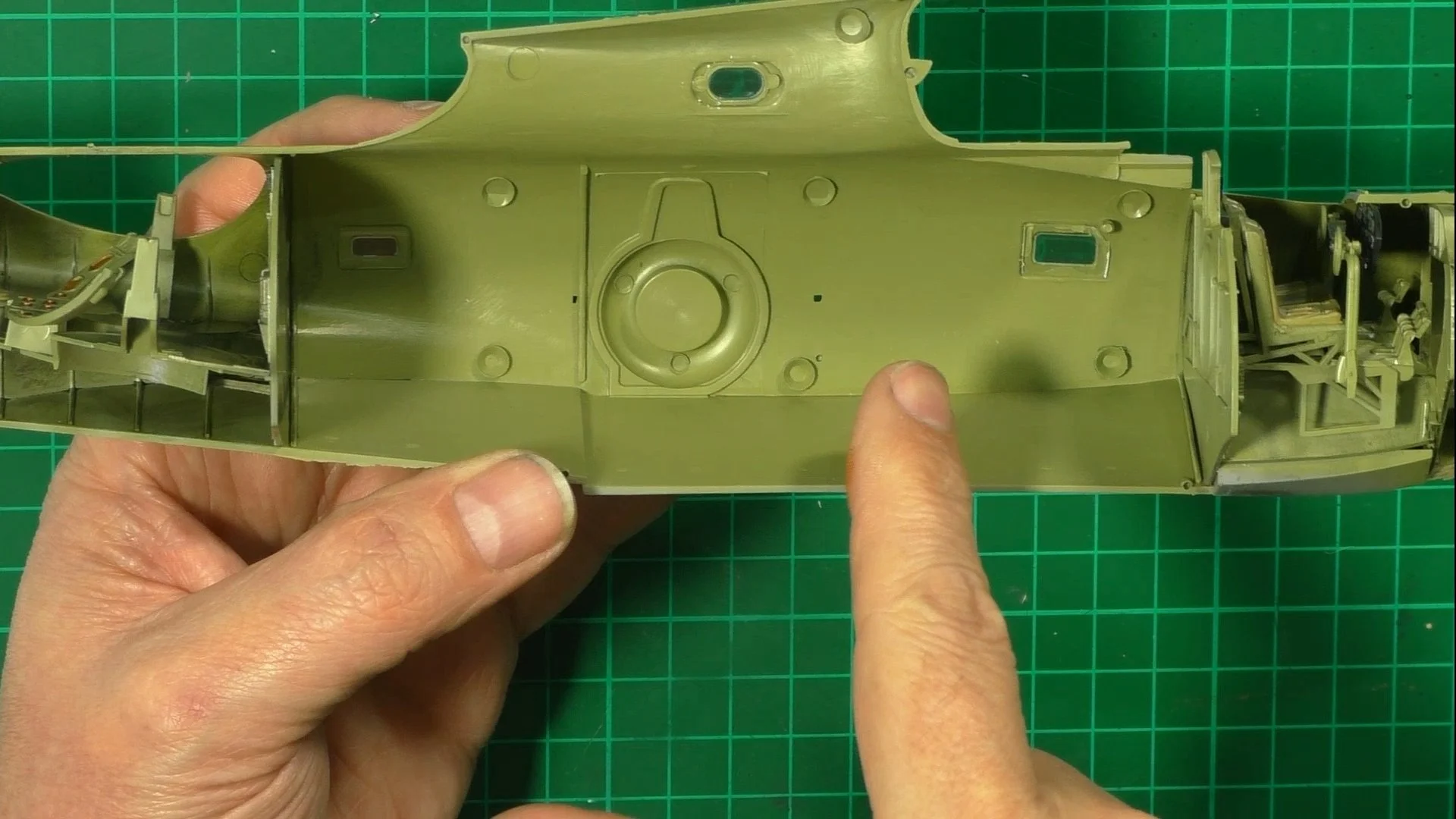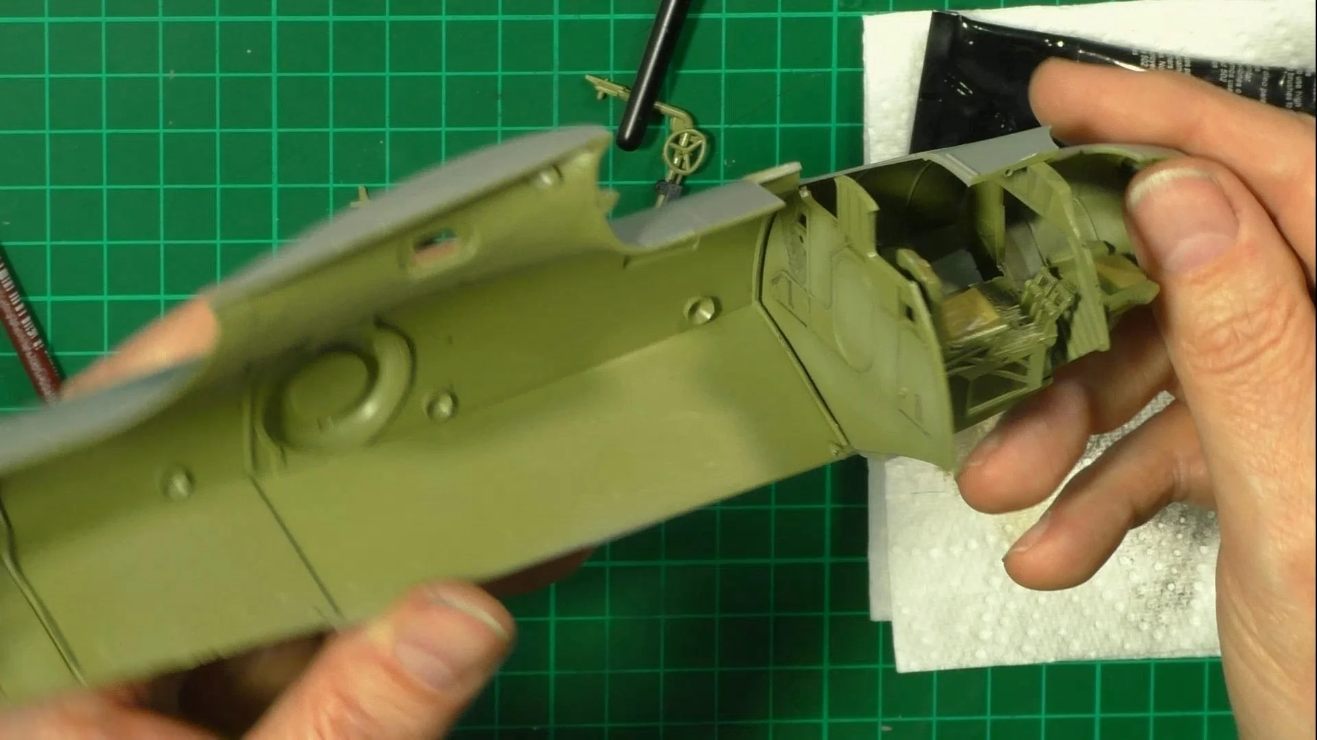 0:00 First up, we weather the cockpit with Metalizers and oils. 11:29 Next, we use UV glue to install the windows and test-fit the two halves together. 20:21 Now it's time to close up the two halves, we use contacta and tape for this. 27:58 Last up for now, we build the five-part wings.