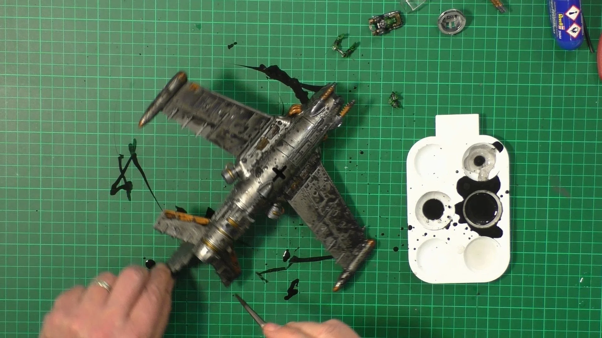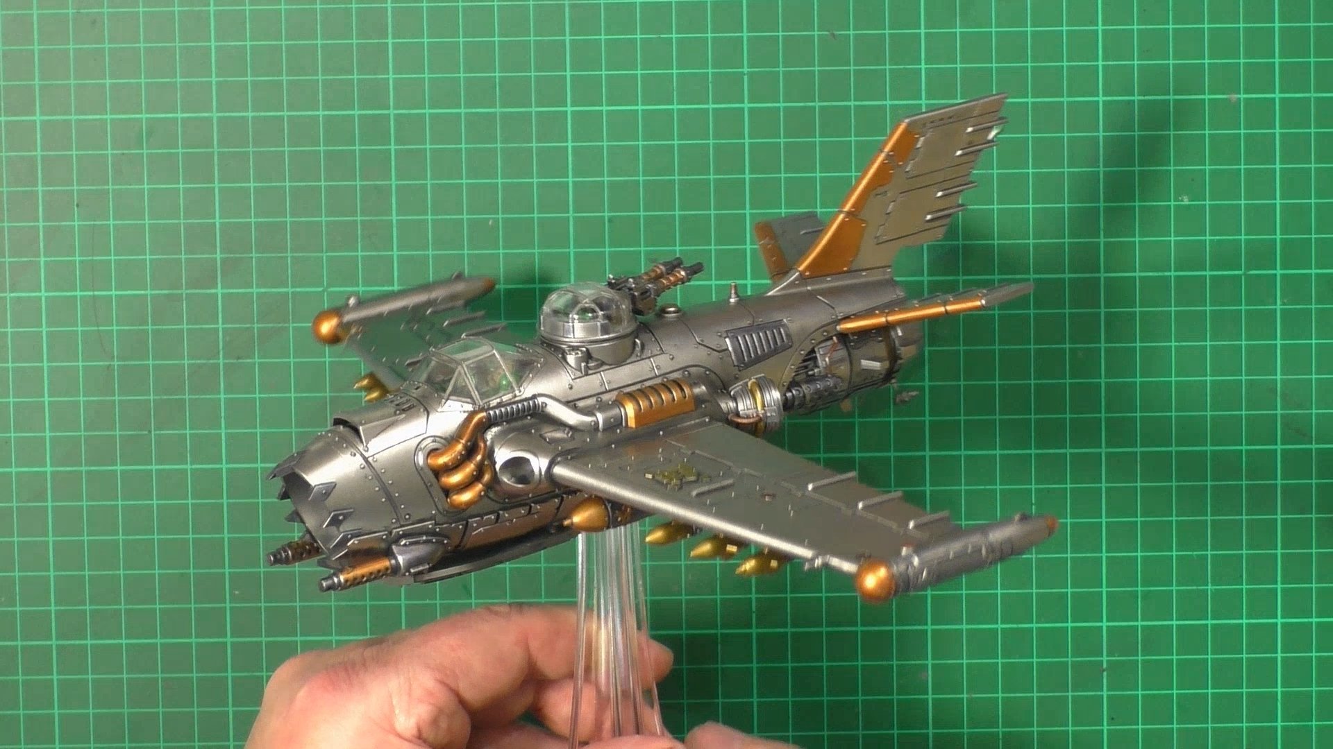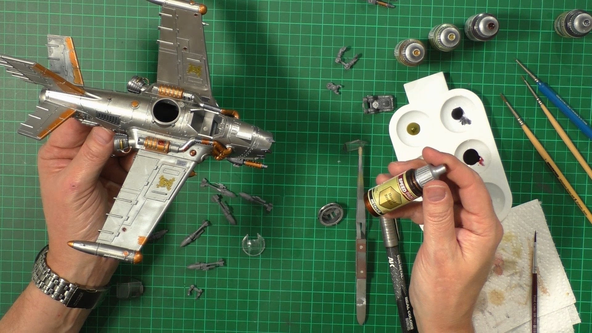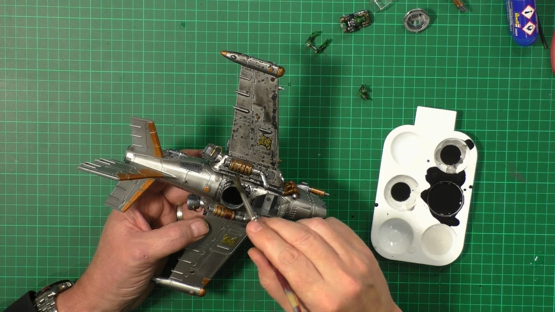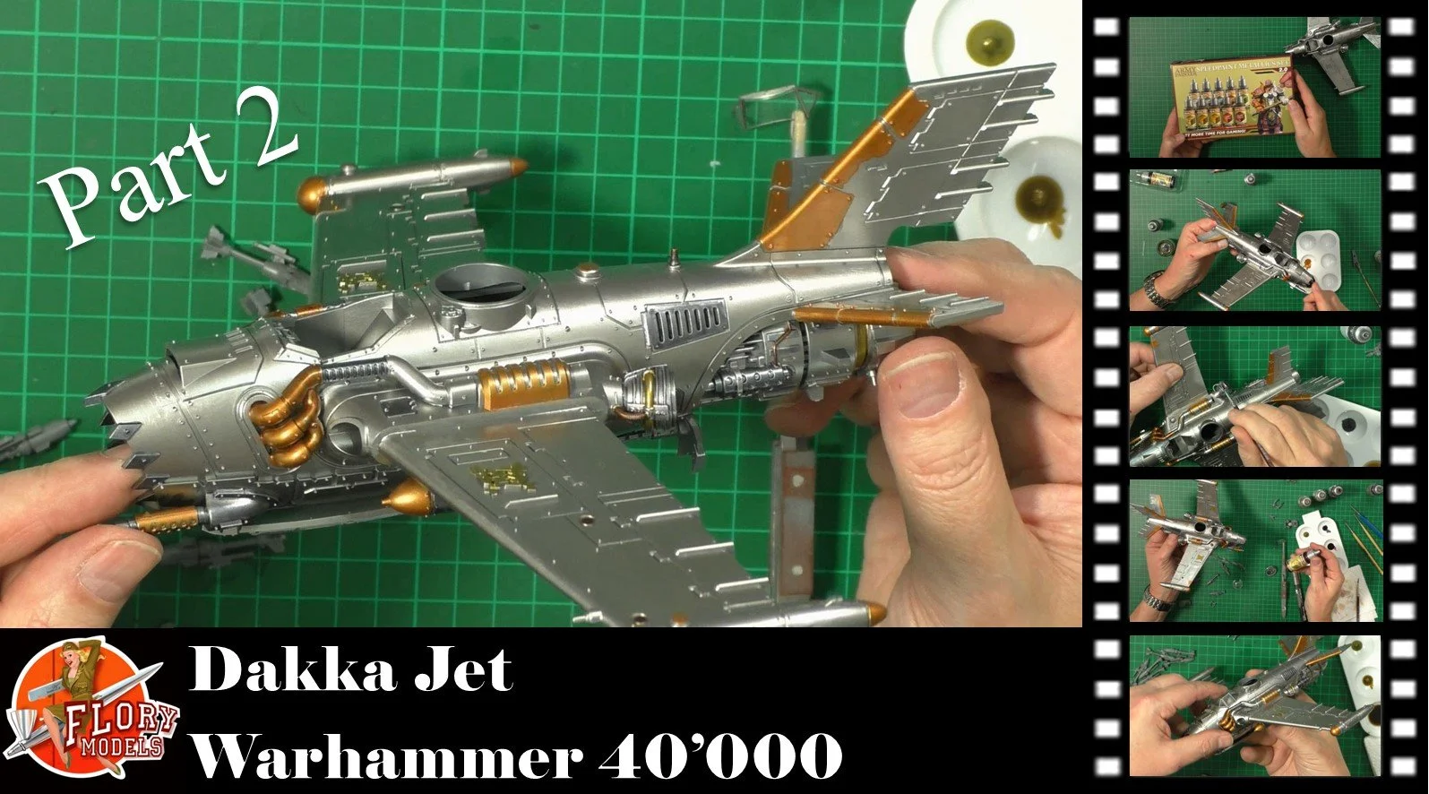 0.00 To start with, give our Ork crew a wash and drybrush 4:39 Next, we use Black wash FMW001 and cover the entire model and allow it to dry. 20:13 With the wash dry, we remove it with a damp paper towel. 25:47 Next up with make a wash and use it to detail with rivers and retail parts. 33:03 Last up, we mount the Jet onto its stand. 38:29 The final reveal and thoughts.