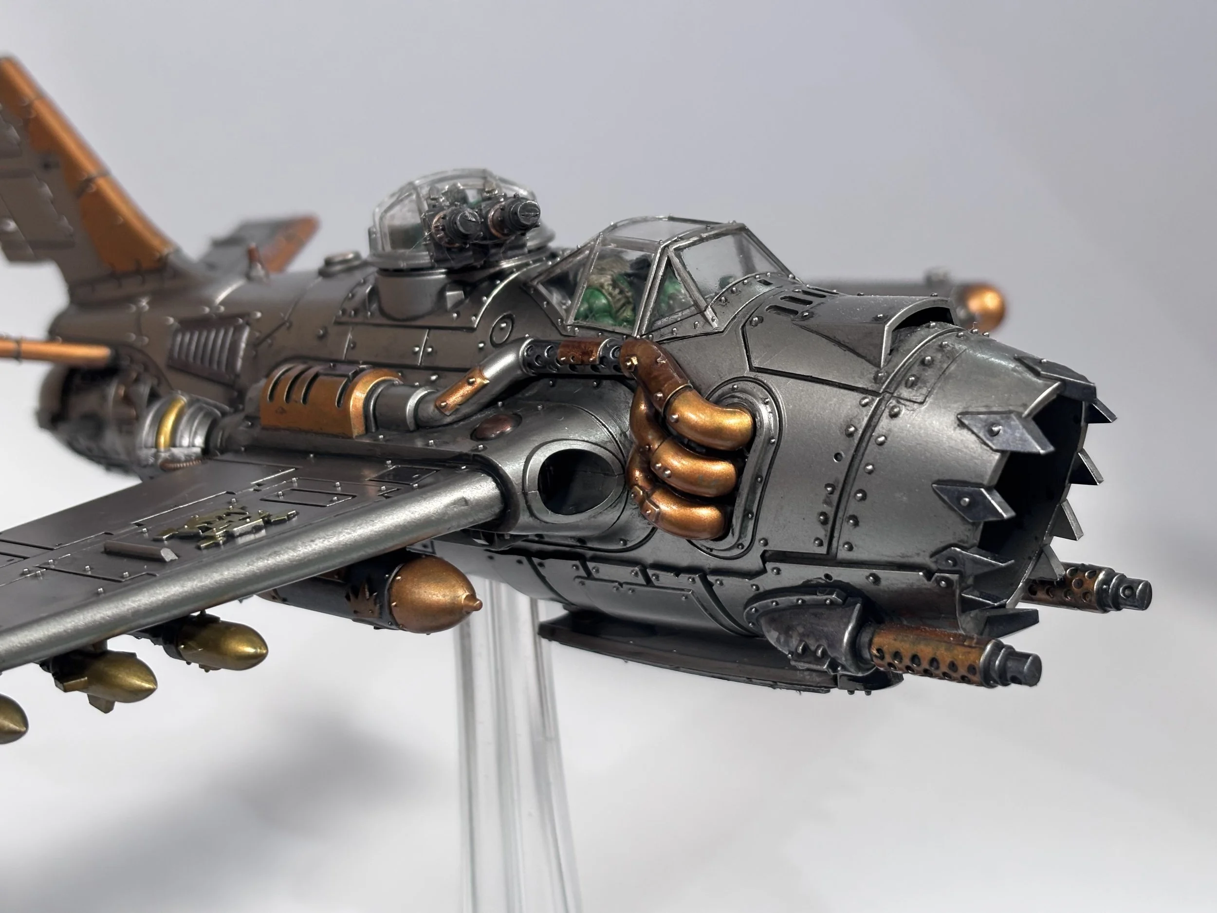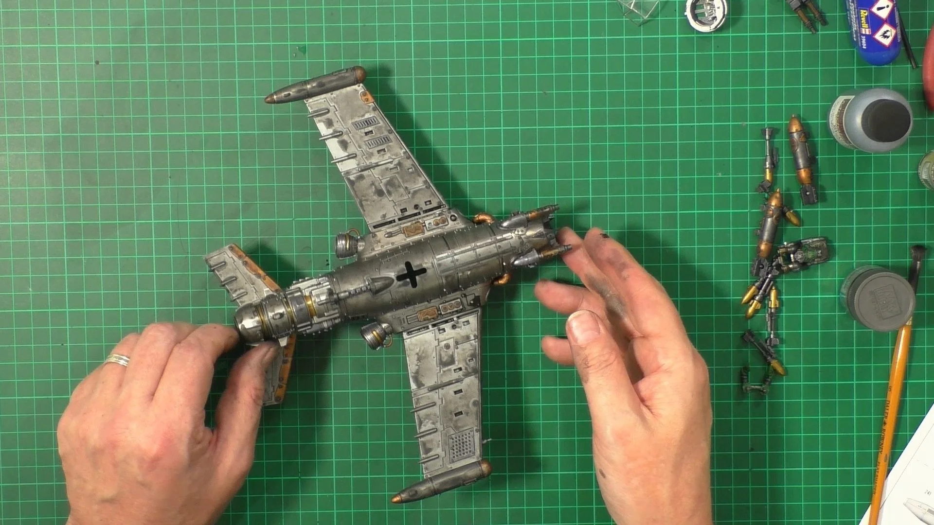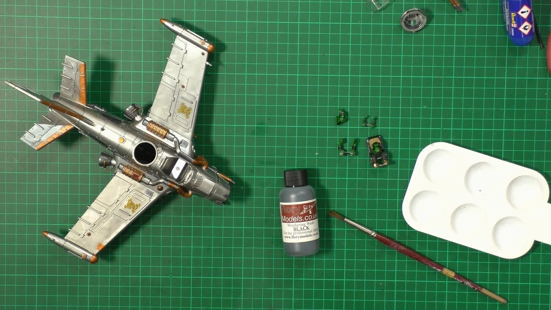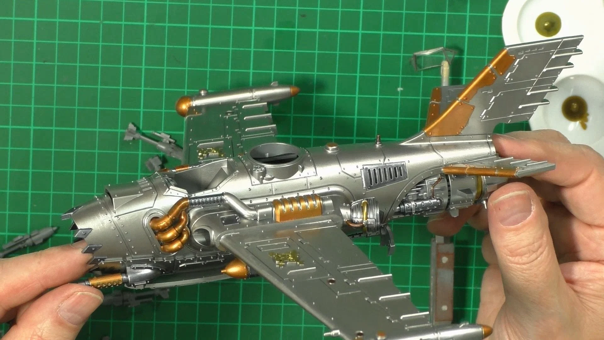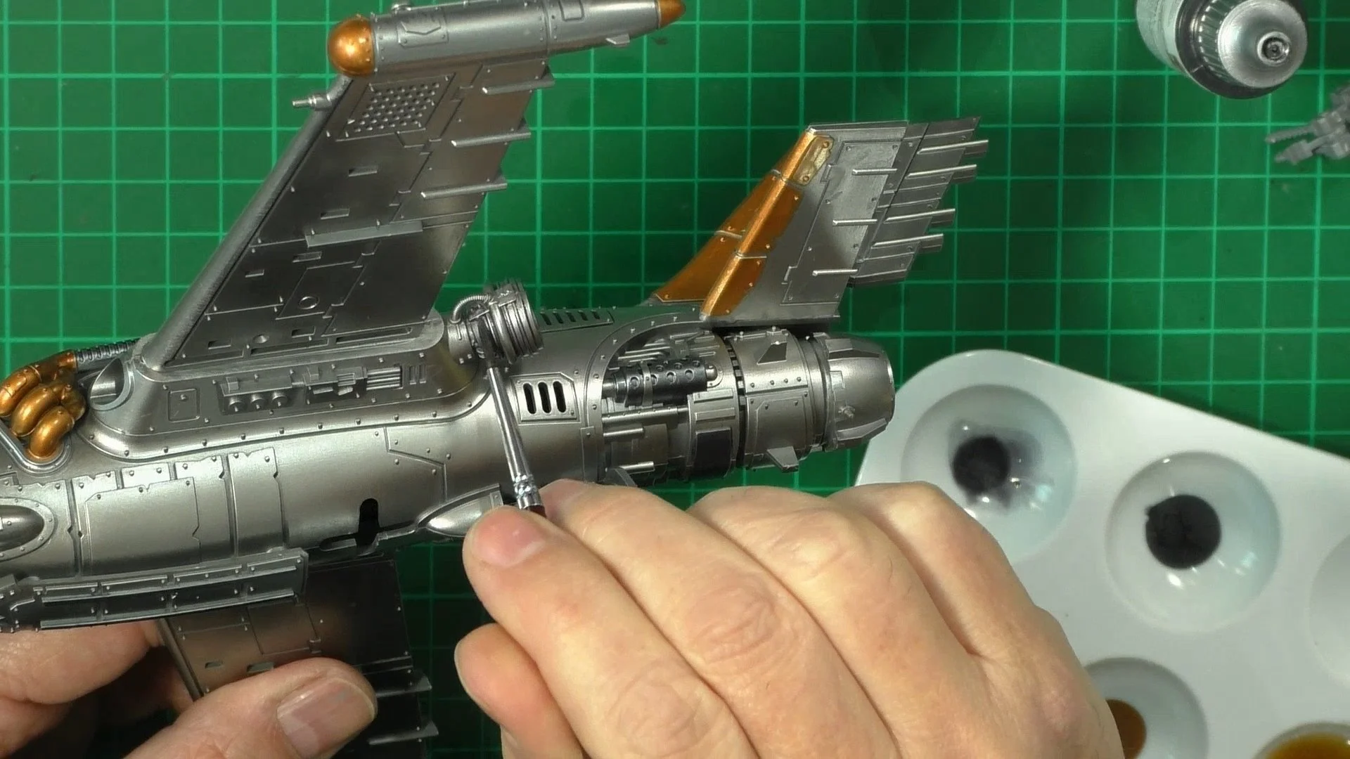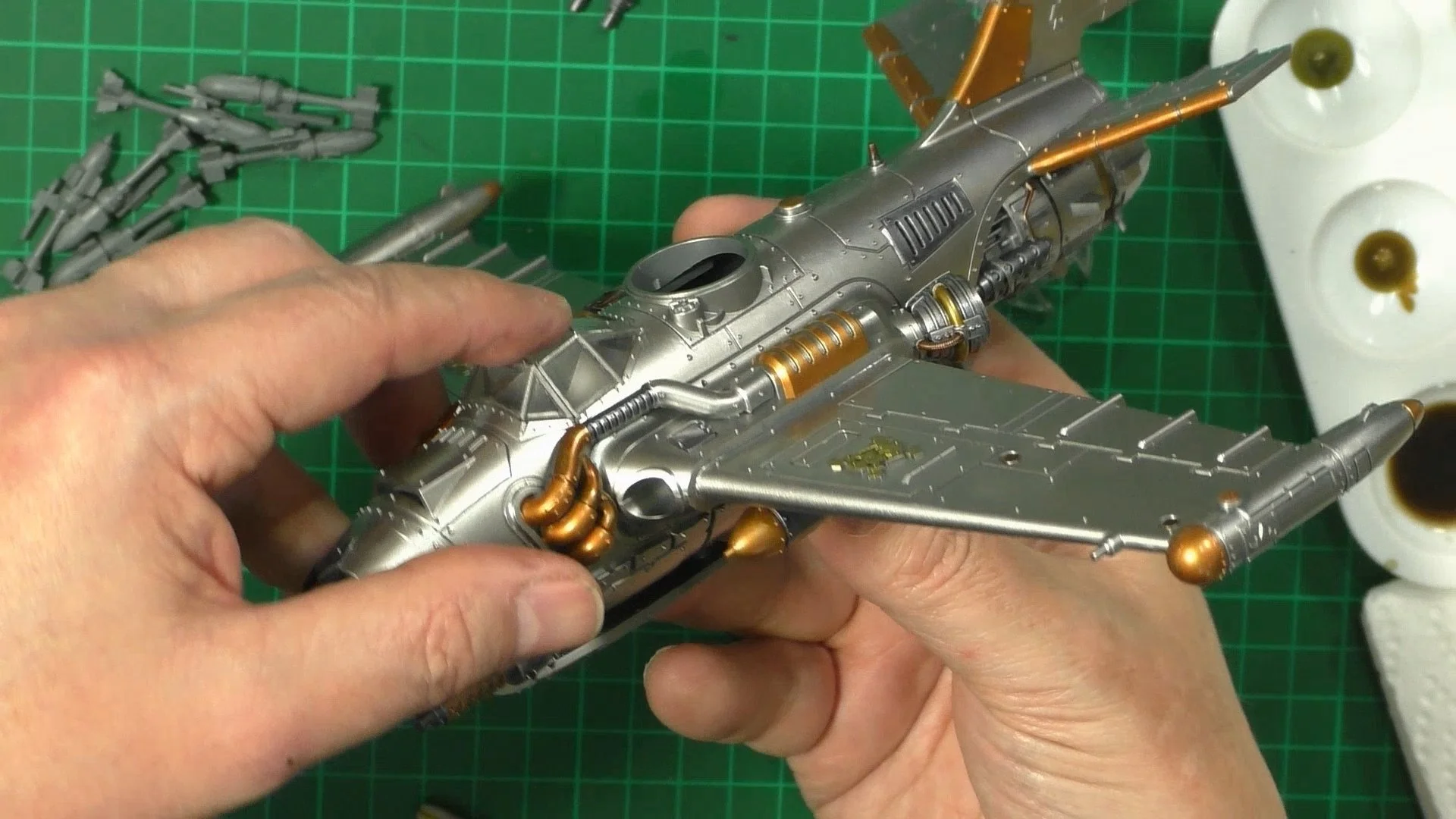 0.00 To start with, give our Ork crew a wash and drybrush 4:39 Next, we use Black wash FMW001 and cover the entire model and allow it to dry. 20:13 With the wash dry, we remove it with a damp paper towel. 25:47 Next up with make a wash and use it to detail with rivers and retail parts. 33:03 Last up, we mount the Jet onto its stand. 38:29 The final reveal and thoughts.