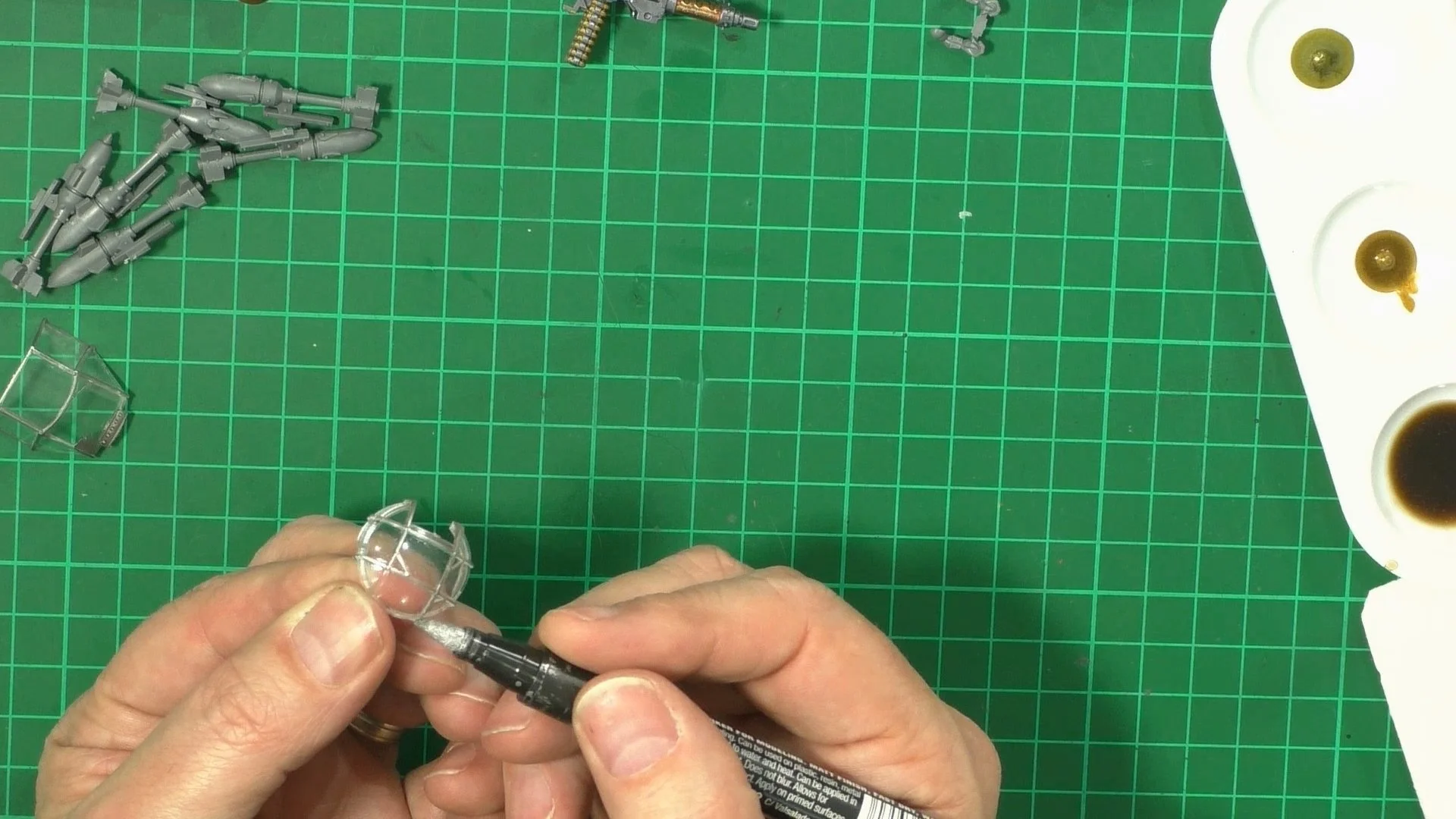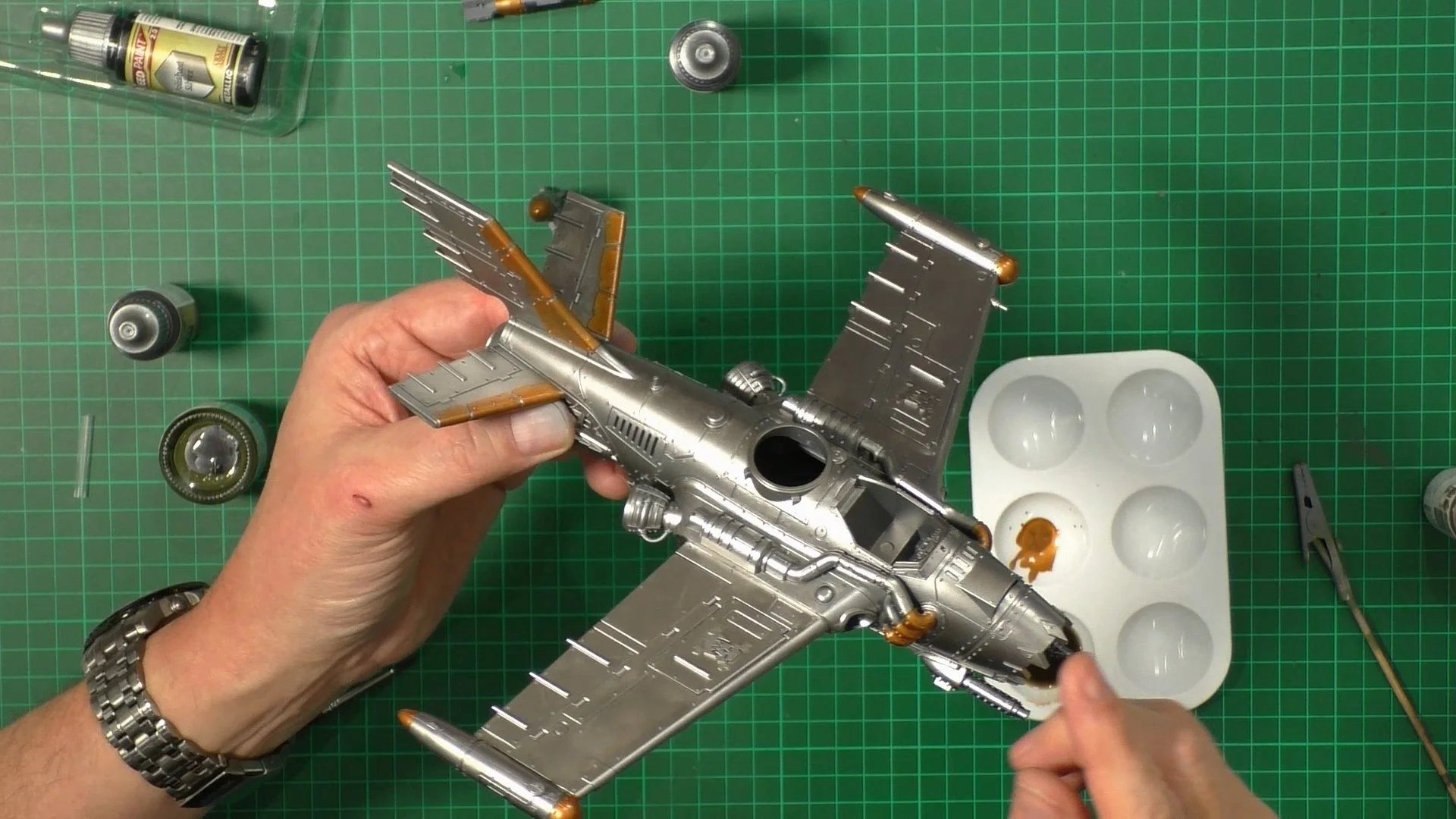 0.00 After a coat of Super Metallics Dark iron SM203, we use something new to me, Army Painter Acrylics 3:47 To start with, we have a look at the paints and have a try with them. 7:56 With good results with the paint, we push on with different colours and effects. 30:06 With the jet looking great, we look at the framework on the clear parts and use markers.