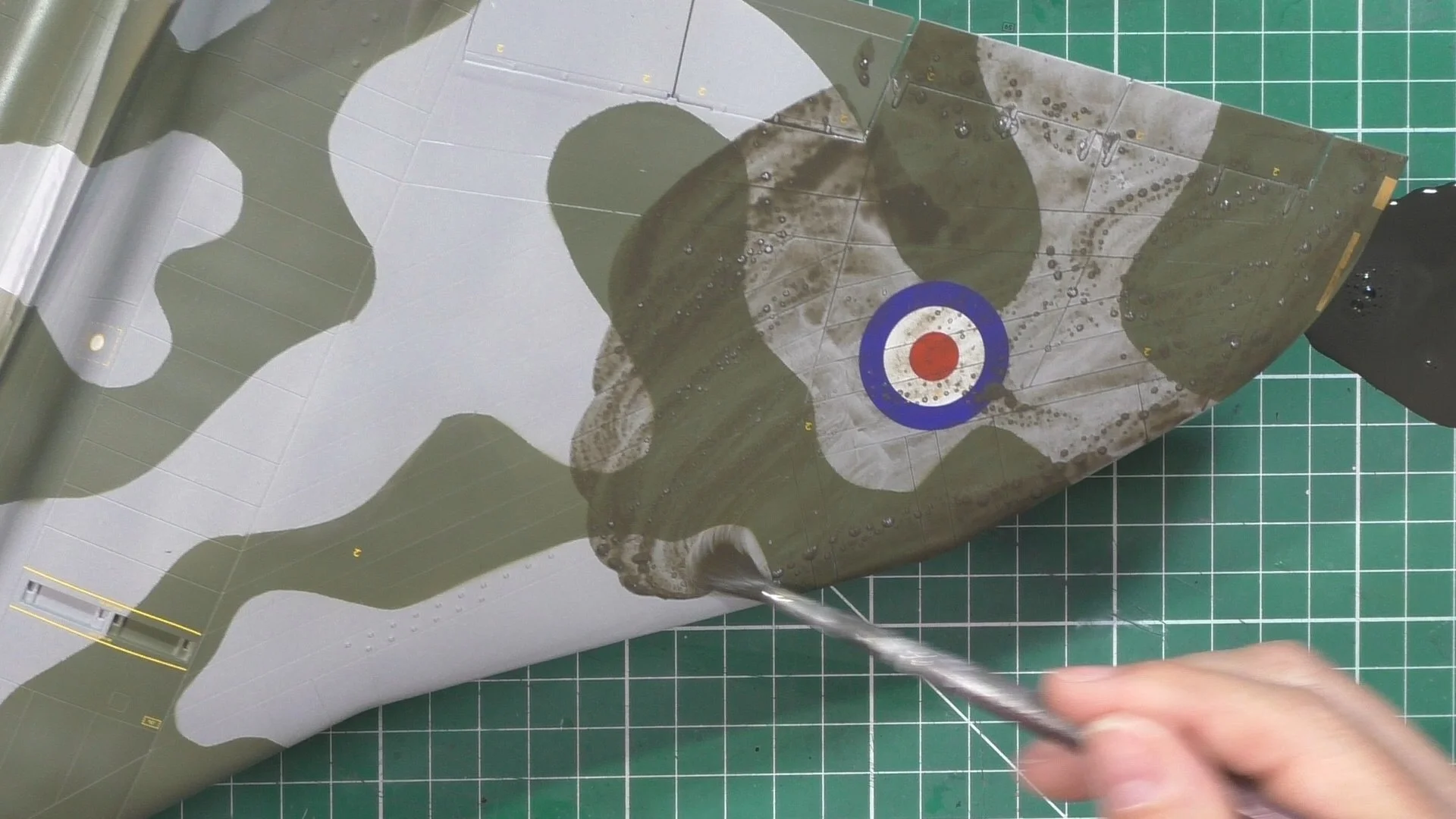 Als de wash volledig droog is, kan deze verwijderd worden met een vochtige doek.. Of nog beter, met een goede keukenrol. U kunt de keukenrol vochtig maken met wat speeksel en vervolgens met cirkelende bewegingen de wash wegvegen. Door cirkelende bewegingen te maken zorgt u ervoor dat de wash in alle panel lines komt waar nog geen wash zit. Afhankelijk van hoeveel de doek bevochtigt wordt, bepaalt deze hoeveel wash wordt verwijderd. Als alleen de panel lines voorzien moeten worden van de wash, dan is een vochtige doek prima. Maar voor een meer verweerde look, kan een droge doek gebruikt worden. Wrijf hiermee lichtjes, zodat er meer wash achterblijft. Dit geeft het model een meer verweerde en vuile uitstraling. Als u tevreden bent met het resultaat, veeg dan nog een laatste keer met een cirkelende beweging in de richting van de luchtstroom. Vergeet niet: eventuele wash die achterblijft nadat een blanke lak is aangebracht, zal veel meer zichtbaar zijn, omdat de wash donkerder wordt.